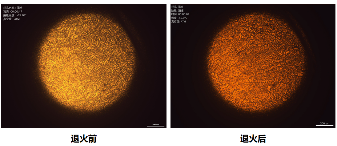退火处理:退火是一种通过升温再降温来改善冰晶结构的方法。冻干显微镜可以实时观察样品退火过程中的结构变化,对退火效果进行评估,帮助研究人员摸索出合适的退火温度和时间。