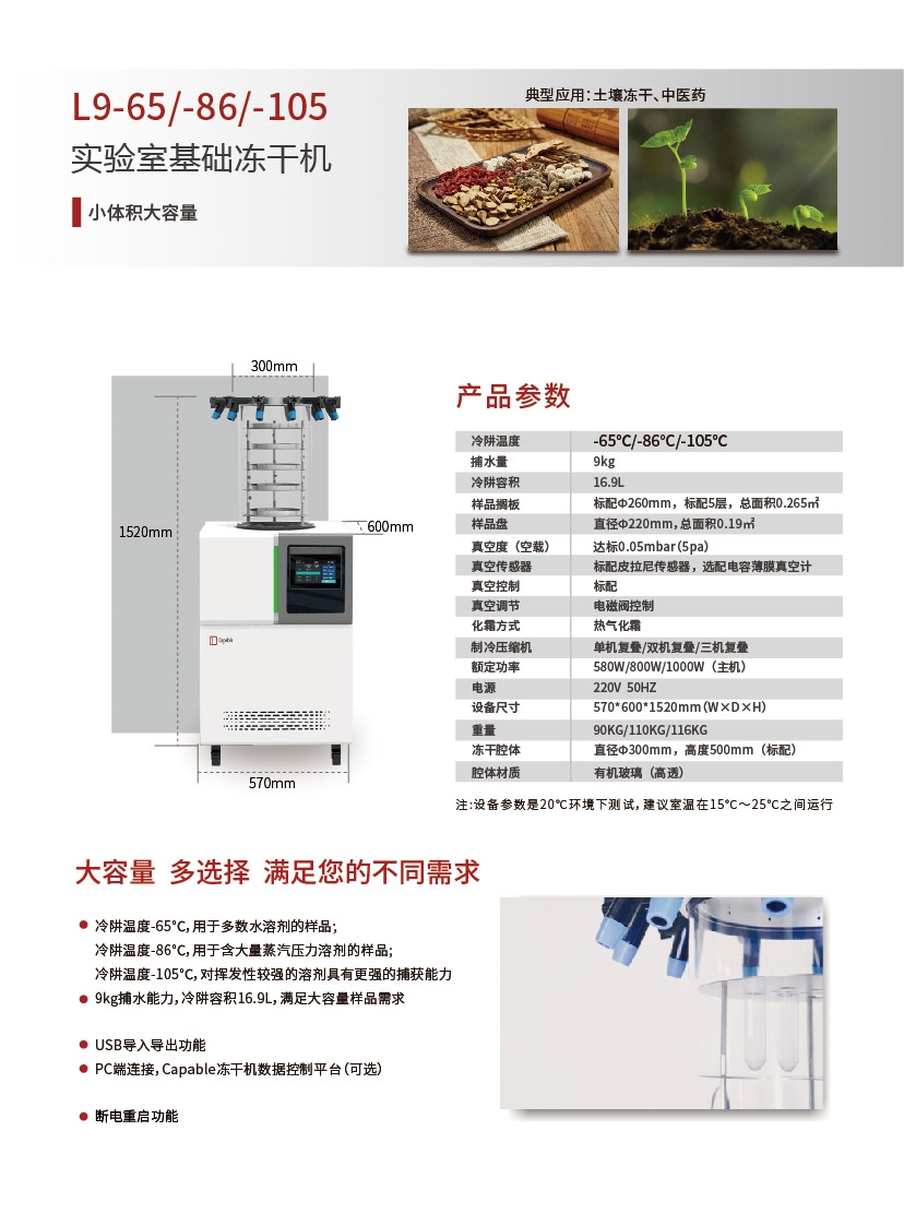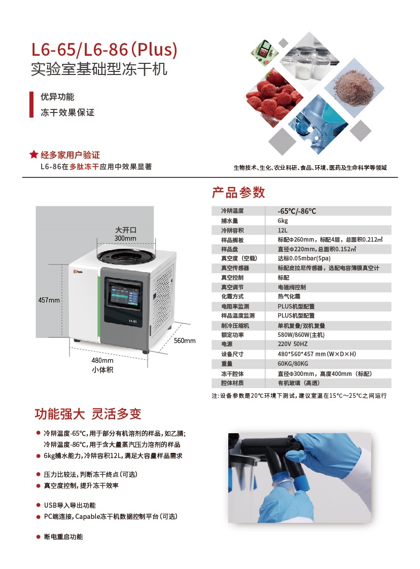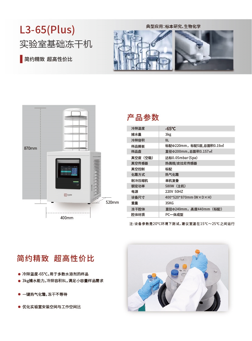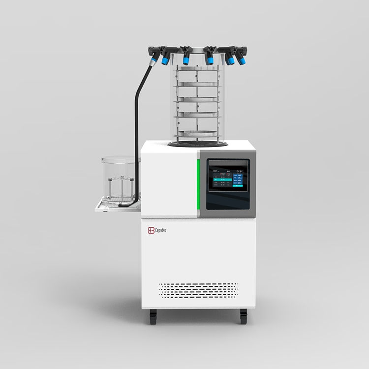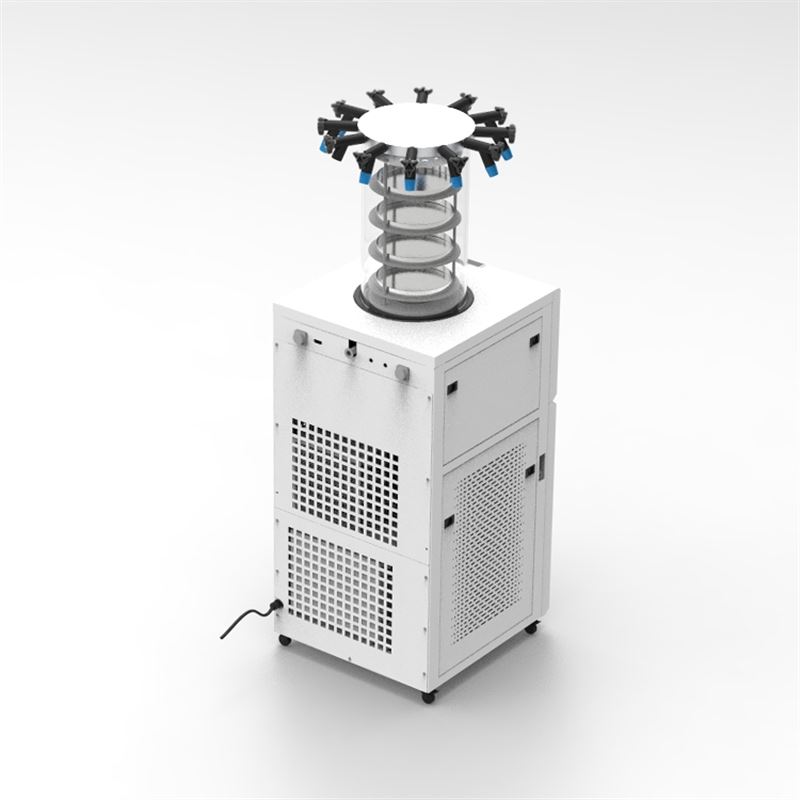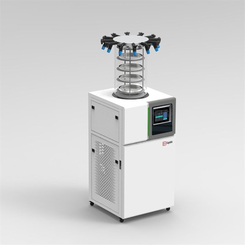 主要特点:立式冻干机的设计简洁,占用空间较小,适合在空间有限的实验室环境中使用。操作便捷性也是立式冻干机的一大优势,用户可以通过触屏控制进行操作,提高工作效率。此外,立式冻干机的干燥效率高,能够快速有效地完成样品的冻干过程。