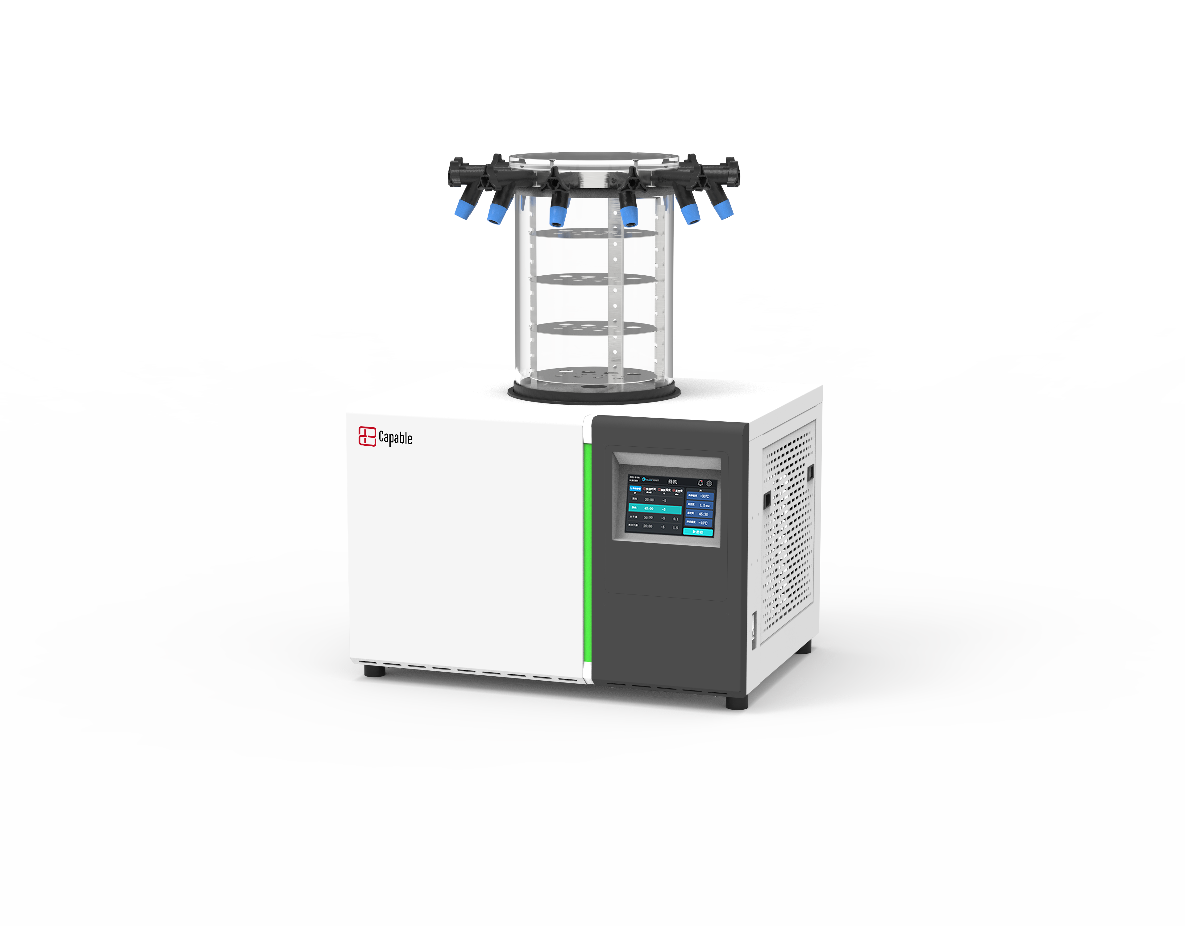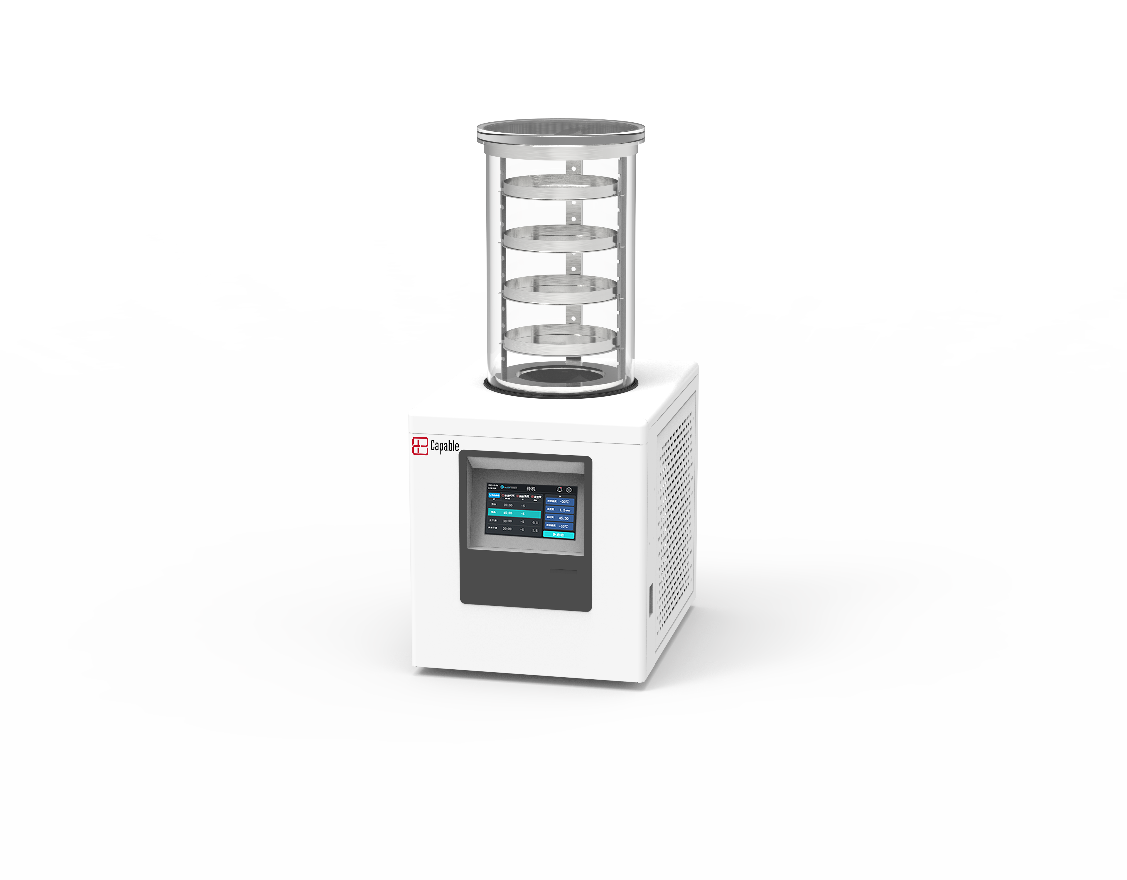 17、7寸触摸彩屏,能同时设置各阶段的参数,运行过程中显示阶段时间、 真空度、冷阱温度、样品温度、总时间等所有主要参数