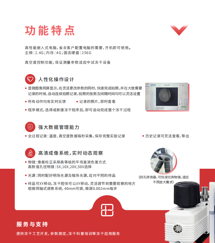 这是一款专用于冷冻干燥工艺研发的的可视化观测设备,融合光学技术与冻干集成控制系统,可动态监测样品在冻干过程中的微观结构变化,帮助用户精准掌控冻干关键阶段,提供数据化、可视化的工艺优化依据。